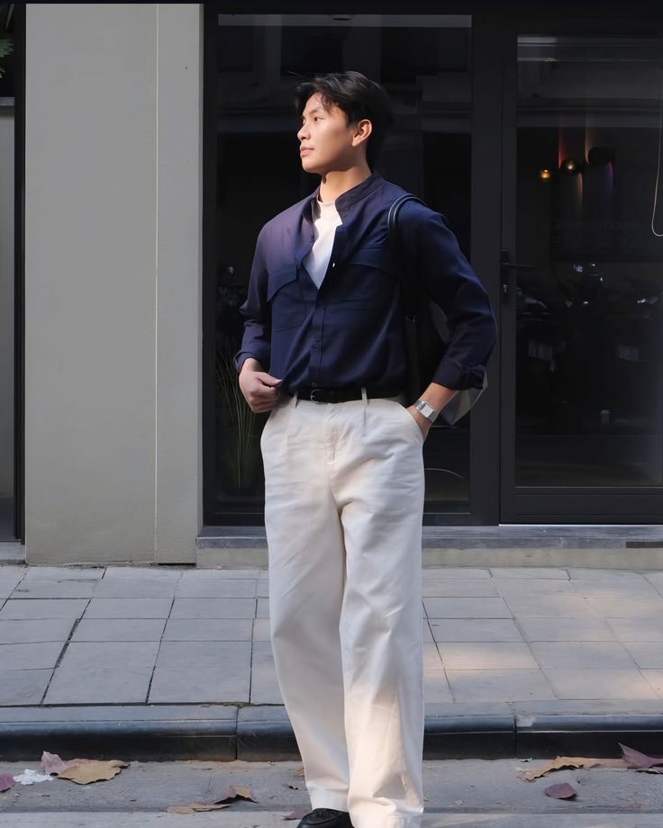 Từ xanh pastel nhẹ nhàng đến xanh navy trầm ấm, màu xanh dương luôn là lựa chọn tuyệt vời khi đi cùng quần trắng. Set đồ này mang lại vẻ tươi sáng, trẻ trung nhưng vẫn giữ được nét lịch sự.