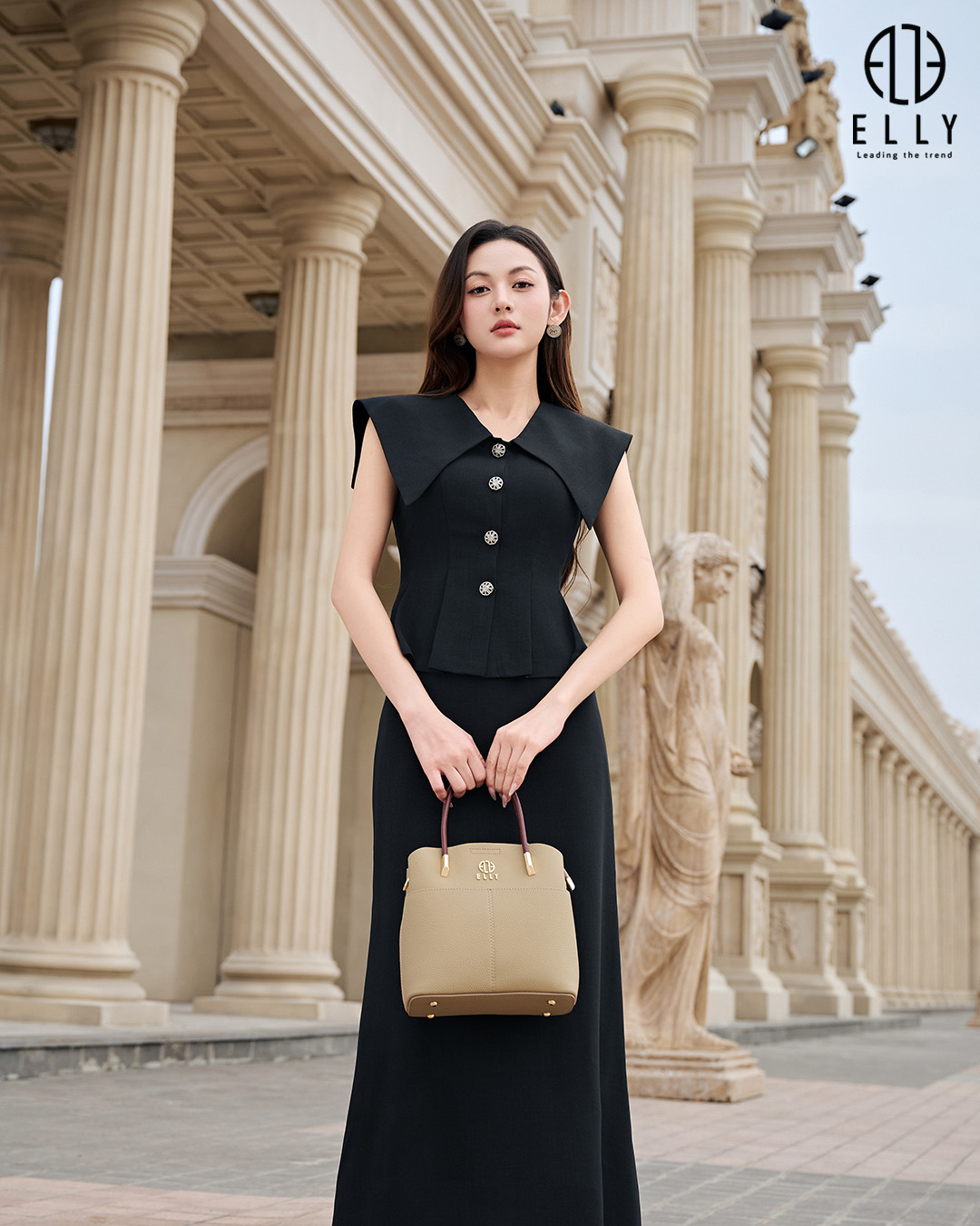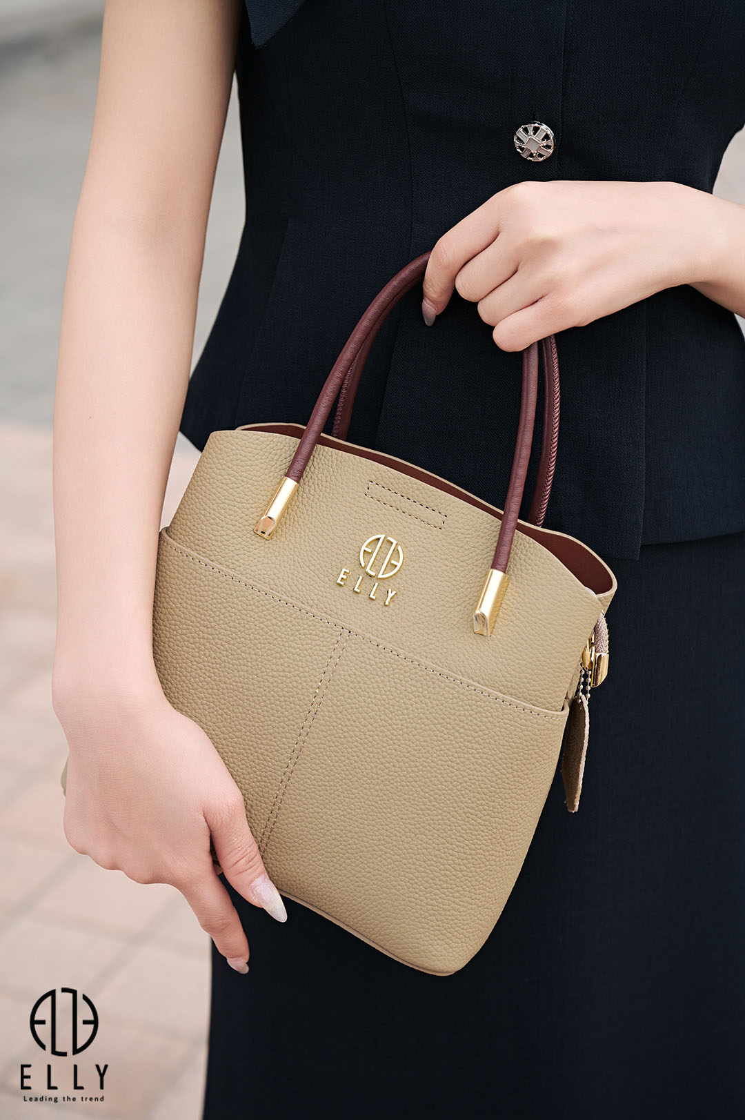 Logo ELLY kim loại mạ vàng tinh tế, nổi bật ở mặt trước túi