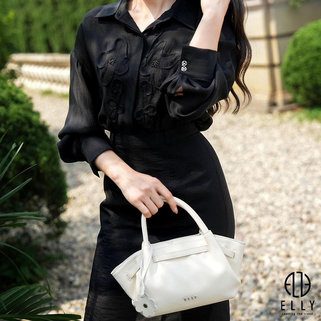 Logo ELLY kim loại nổi bật ở mặt trước cùng chi tiết charm xinh xắn giúp tăng điểm nhấn nữ tính. Túi có thể xách tay hoặc đeo chéo linh hoạt, phù hợp cho cả đi làm và dạo phố.