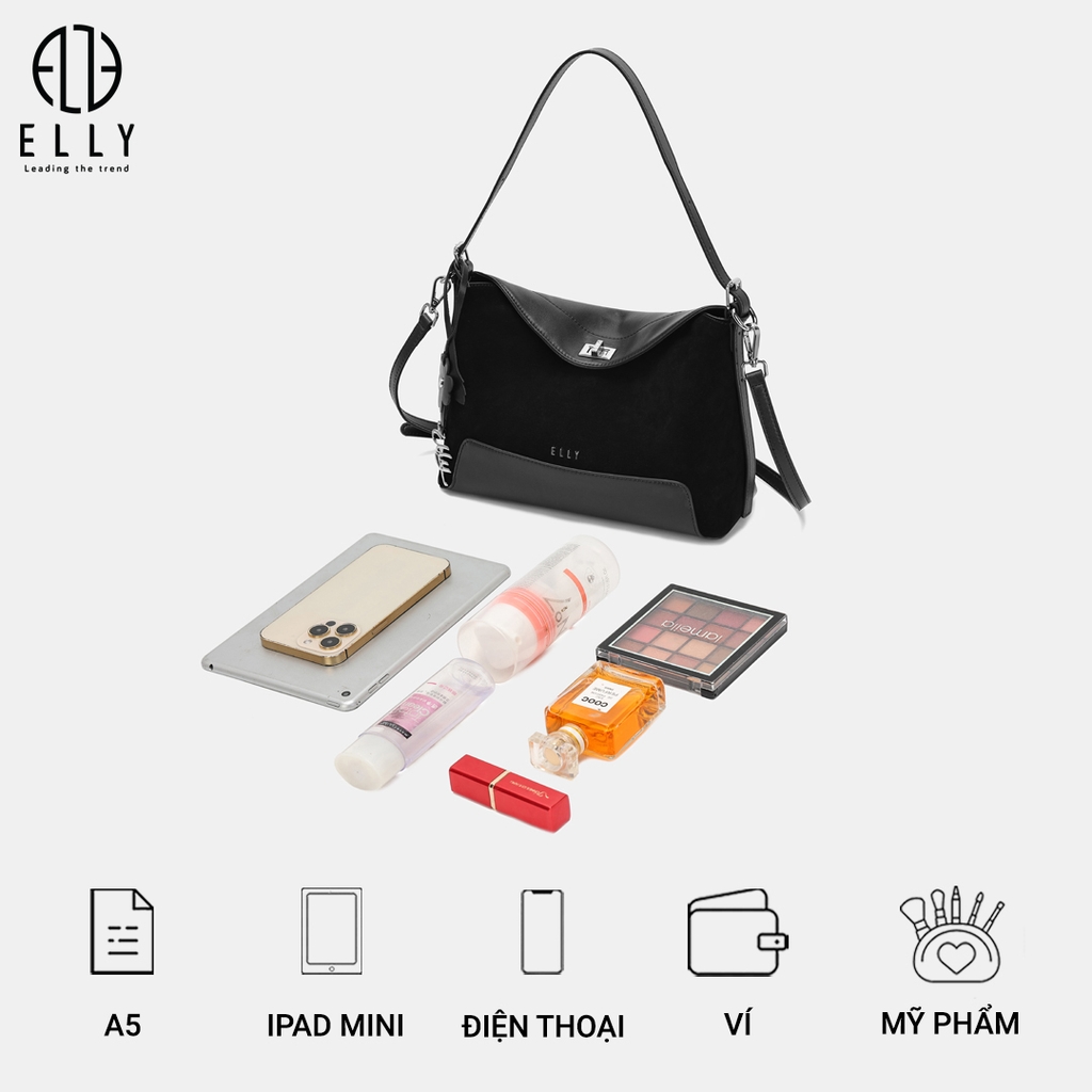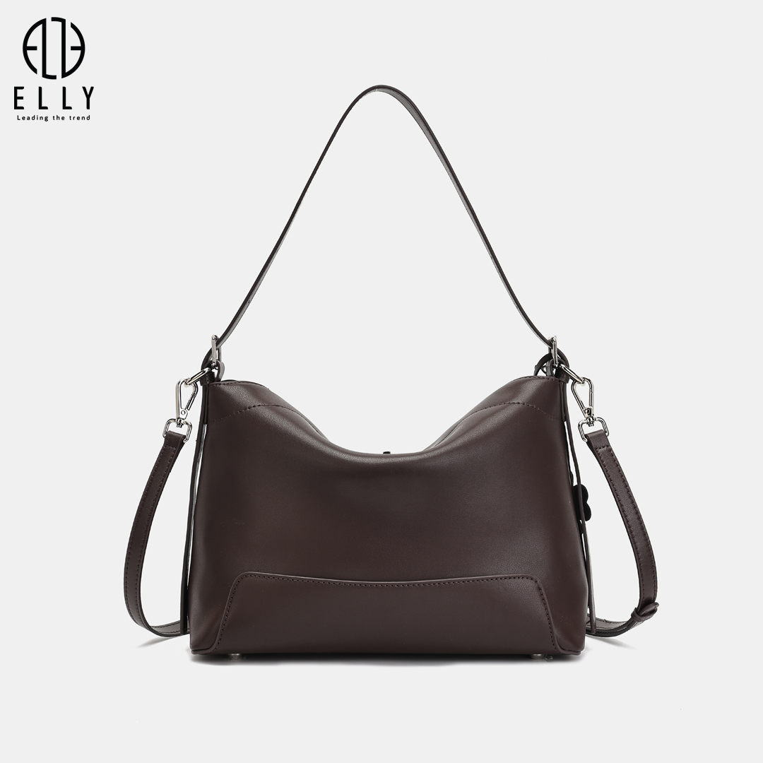 Túi xách nữ ET216 gây ấn tượng với phom dáng mềm mại, nắp túi cong nhẹ thanh lịch cùng chất liệu da cao cấp phối hai tông màu hiện đại, mặt trước in logo ELLY tinh tế tạo điểm nhấn sang trọng; thiết kế đi kèm tag da hình hoa và charm chữ ELLY nổi bật, quai đeo linh hoạt có thể xách tay hoặc đeo chéo, phù hợp sử dụng khi đi làm, dạo phố hay gặp gỡ cuối tuần.