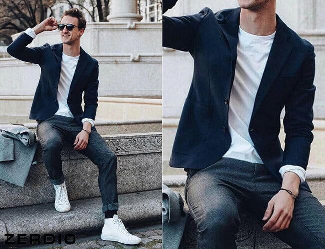 3. Áo khoác nhẹ + áo thun cổ tròn + quần jeans tối màu
