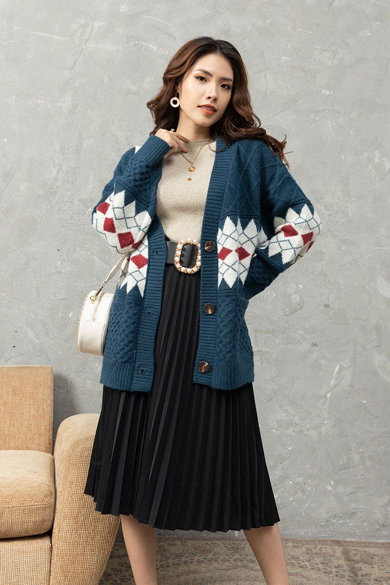 6. Áo khoác cardigan mỏng và chân váy dài xếp ly