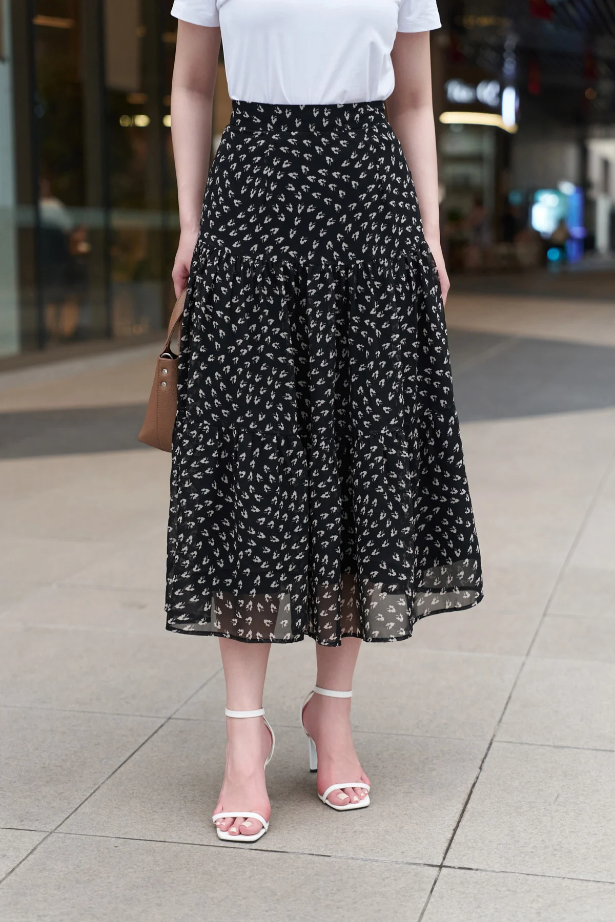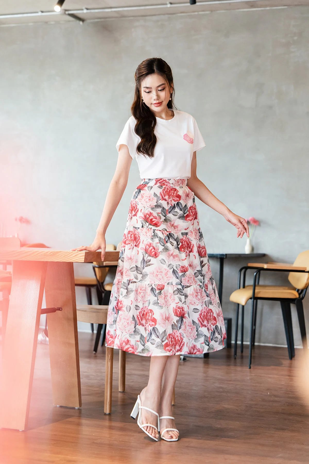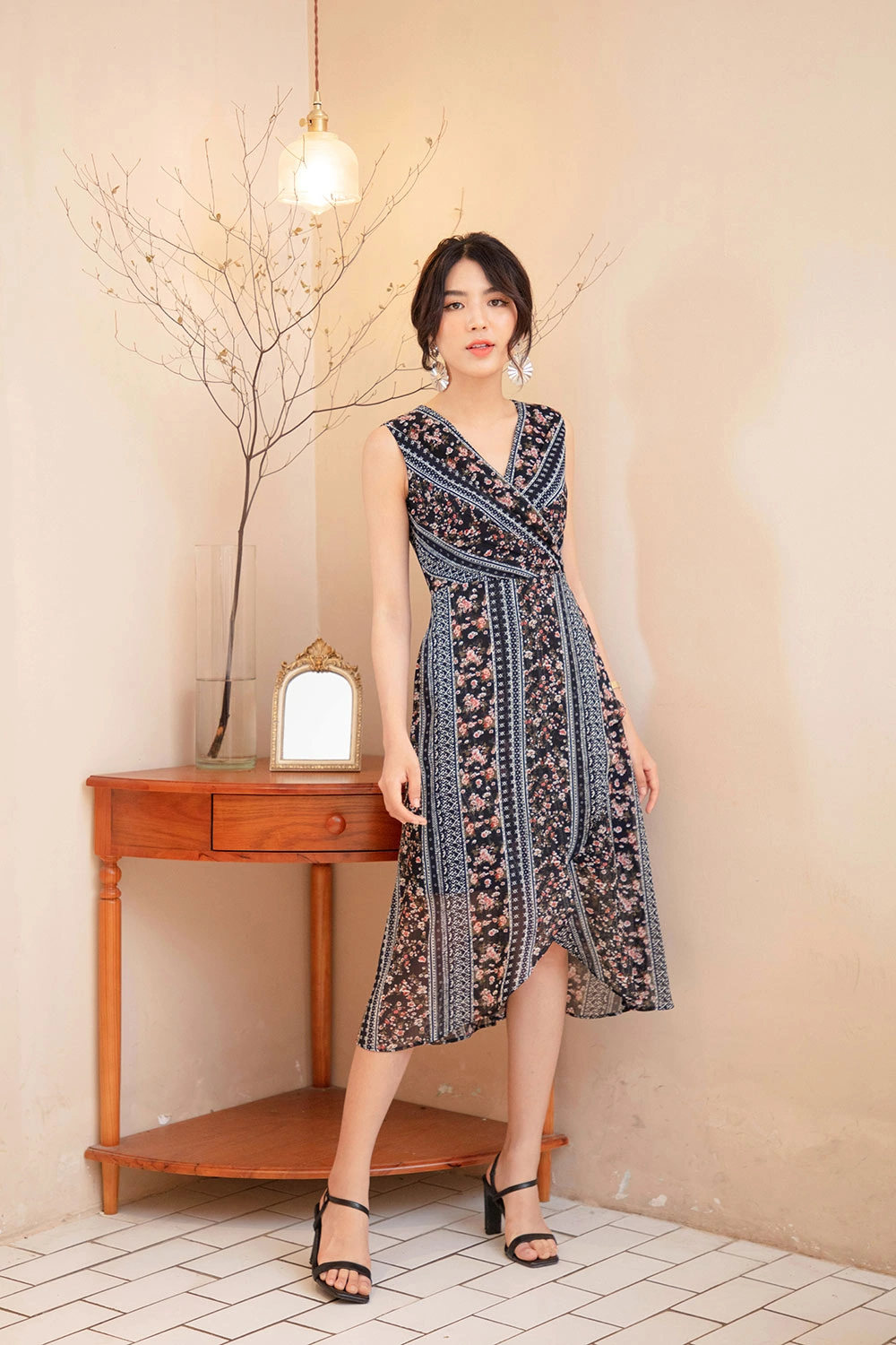 5. Đầm hoa + Giày sandal cao gót