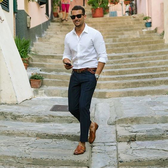 Phong cách du lịch thoải mái nhưng vẫn đậm chất nam tính. Giày tây da cao cấp là lựa chọn tuyệt vời cho những ngày di chuyển nhiều.