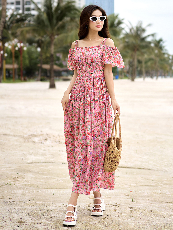 Một chiếc váy maxi họa tiết nhẹ nhàng tôn lên sự dịu dàng, khi phối cùng túi cói và kính mát bản to, quý cô vừa có vẻ lãng mạn vừa bảo vệ da khỏi nắng gió. Outfit này sẽ là lựa chọn phù hợp nhất cho các quý cô khi đi biển.